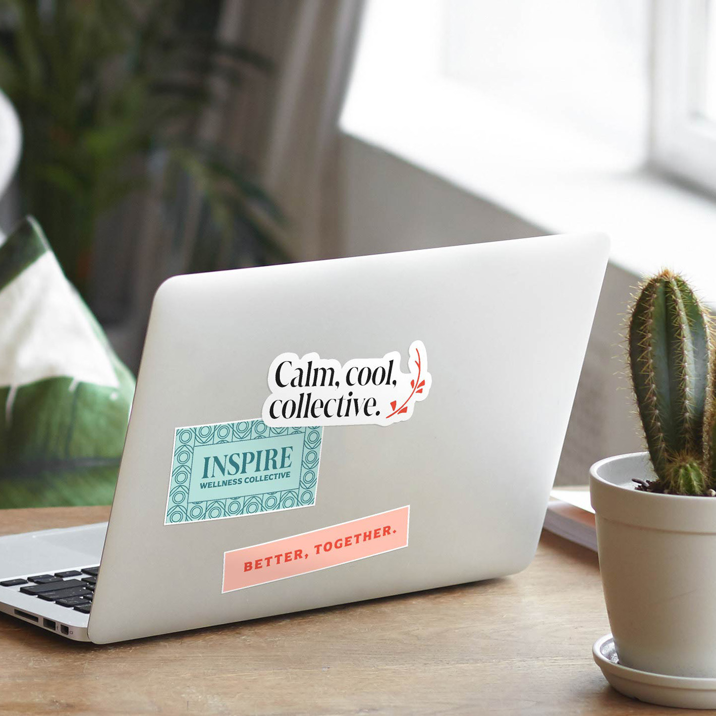 Primary touchpoints (such as business cards, letterhead, and website landing pages) rely on the primary cool palette with geometric designs. More familiar uses, like stickers and social media, incorporate the warmer end of the palette, and bring in floral elements and playful iconography.