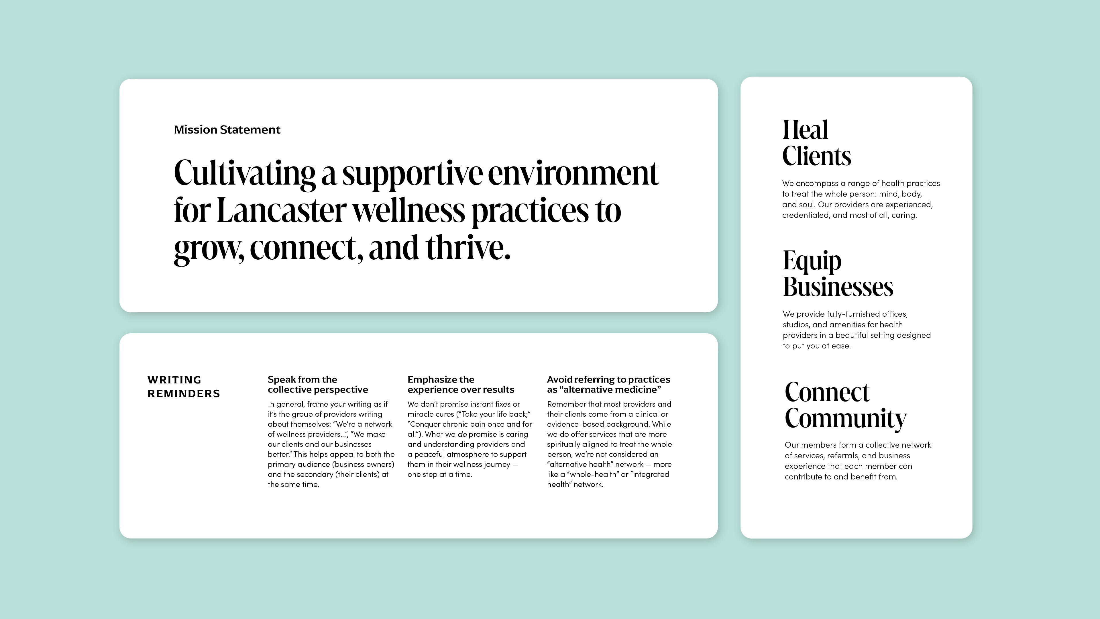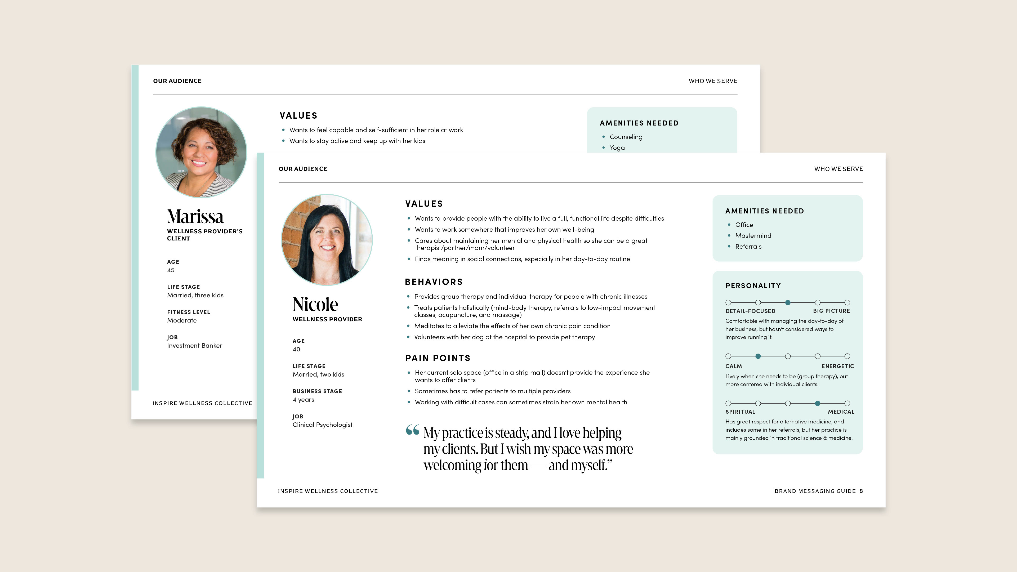The Inspire brand voice primarily speaks to wellness providers who want a flexible, supportive space to grow their business. The tone is supportive, calm, and aspirational.